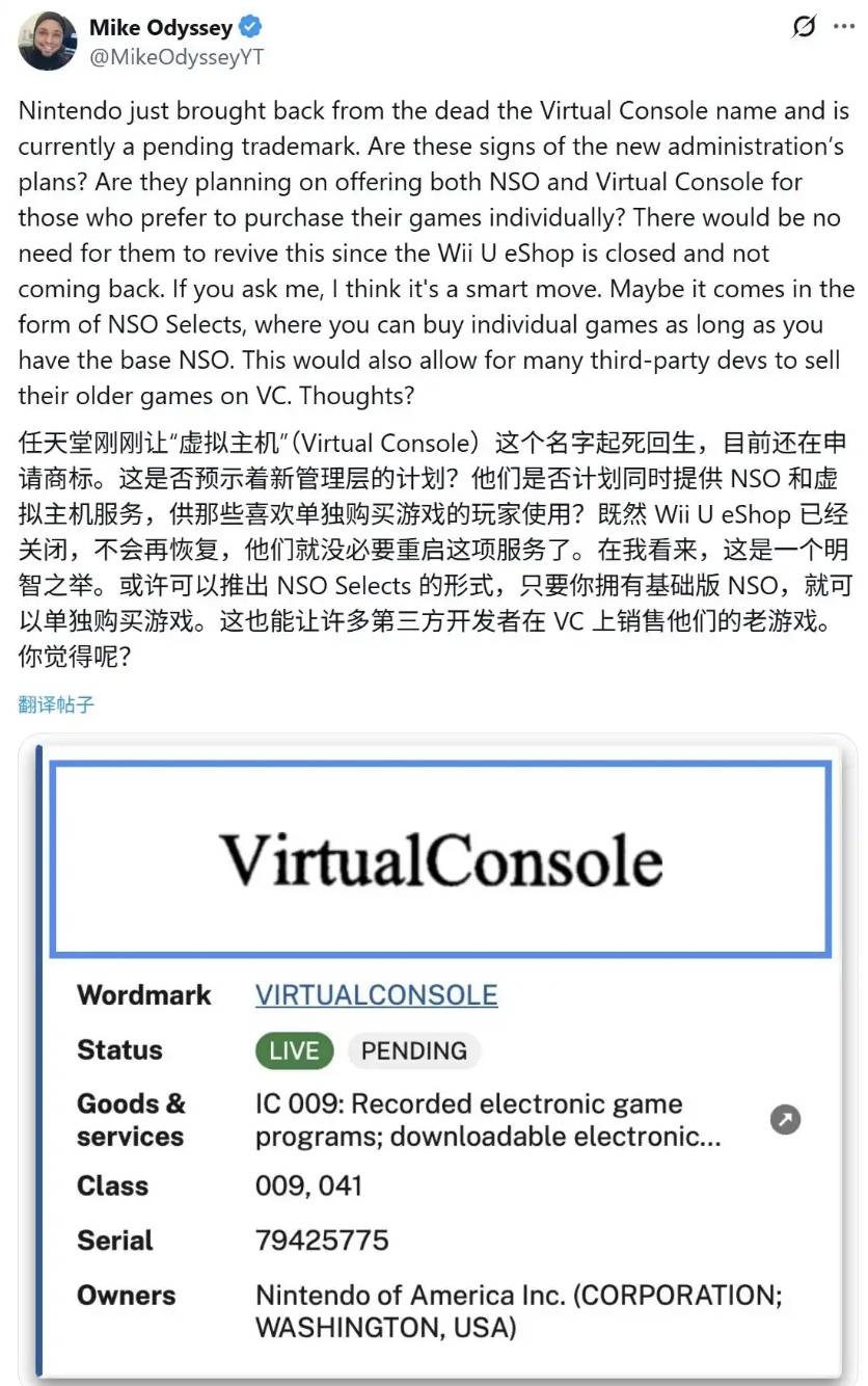 网友Mike Odyssey昨日(10月20日)在X平台发布推文,曝料称任天堂在美国提交了“Virtual Console(虚拟主机)”新商标,引发玩家对该服务回归的期待。